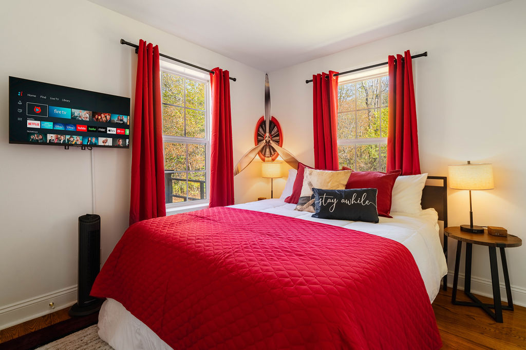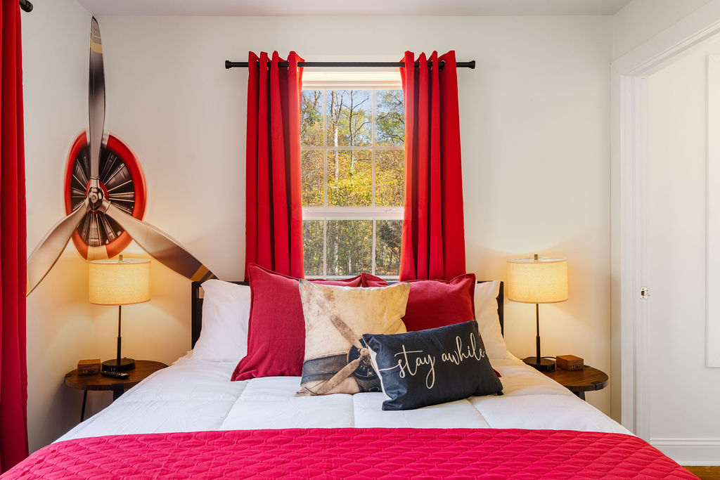 – Custom aviation décor, cozy queen bed, and plenty of storage.