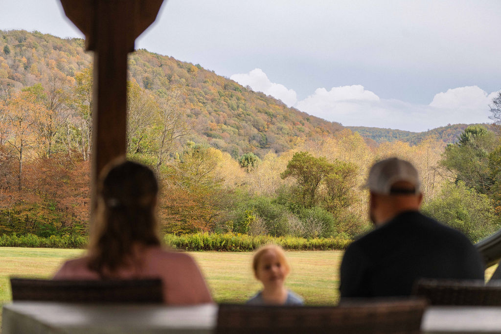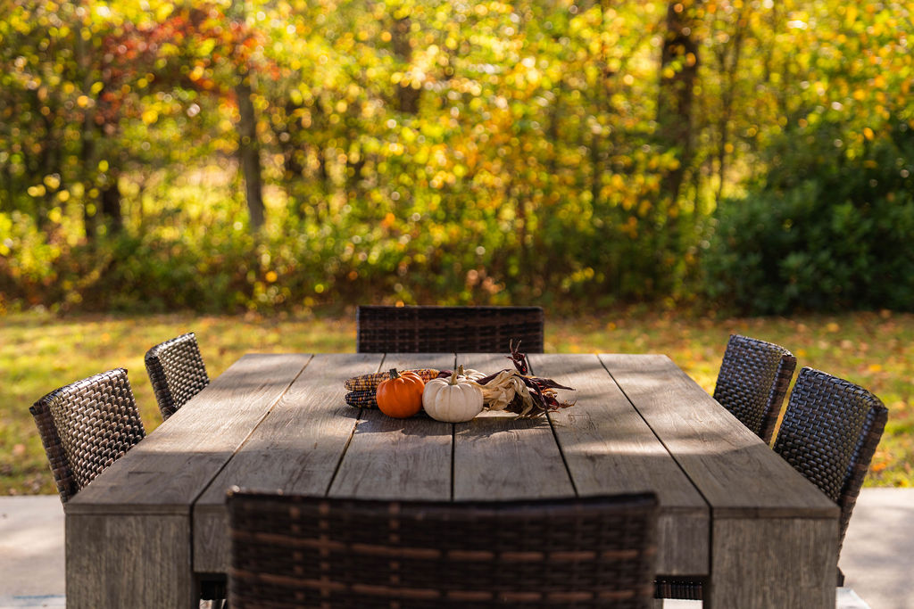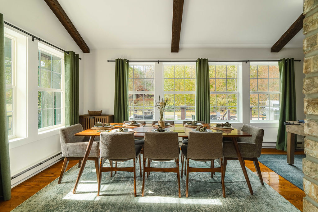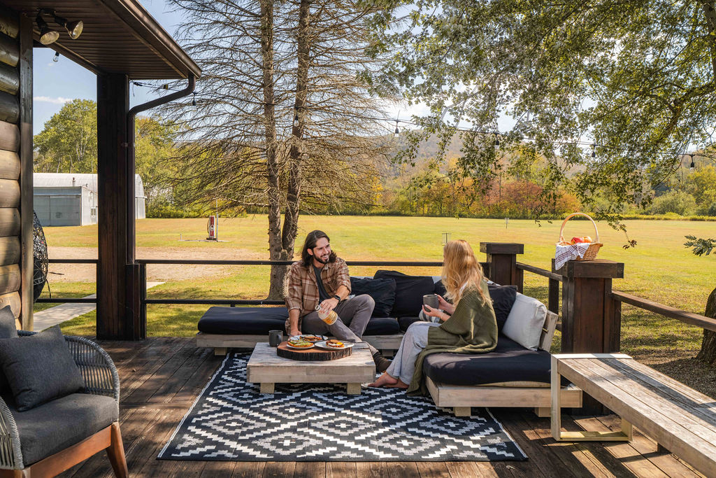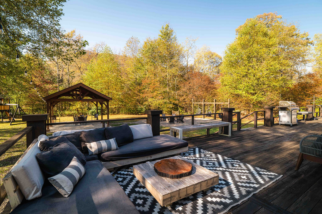 🌿 Wraparound Deck – Expansive outdoor space with lounge seating, dining area, and panoramic views of the surrounding forest and meadows.