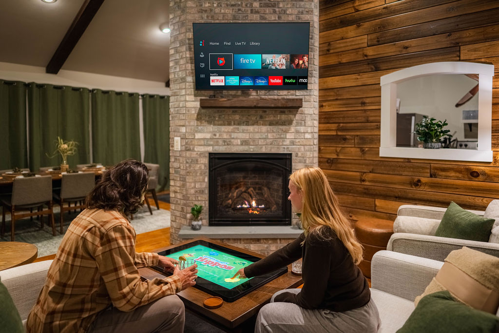 🔥 Living Room – Cozy up by the gas fireplace on a plush sofa (which converts into a full sleeper) and enjoy game night at the custom coffee table with a built-in Infinity Gaming Table.