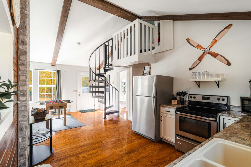 Whether you’re roasting marshmallows by the oversized fire pit, soaking under the stars in the 5-person hot tub, or exploring the property’s hangars and wooded trails, Runway Retreat blends whimsical aviation charm with upscale modern design.
